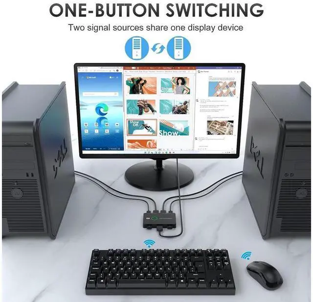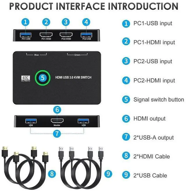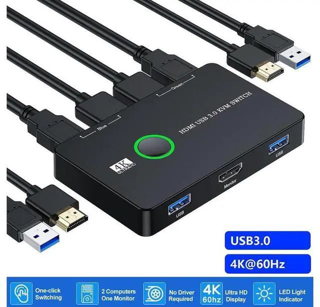 This HDMI KVM Switch can achieve two computers or laptops connected to a single monitor, furthermore two computers can share 2 USB 3.0 peripheral devices. You can share a single USB keyboard, USB mouse and HDMI monitor with both systems, it not only a keyboard mouse switch but also a monitor switch.