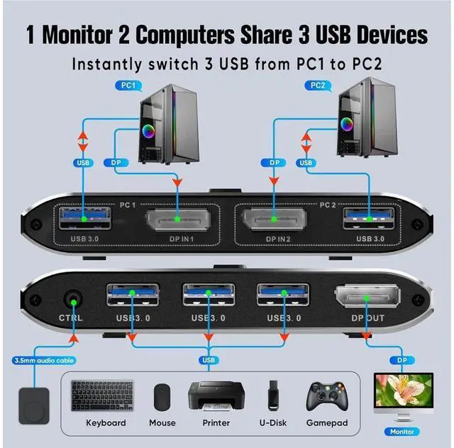 [DP KVM Switch for 1 Monitor & 2 Computers] This 2-Port DP 1.4 KVM Switch enables seamless control of 2 PCs, sharing a single monitor and a set of USB 3.0 keyboard & mouse. Quickly toggle between computers to maintain a tidy workspace. Supports two switching methods: wired remote and button control. Note: Hotkey switching is not supported.