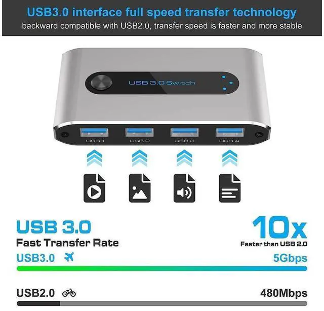 The 4-Port USB 3.0 Switch is a great option for sharing 4 USB 3.0 or USB 2.0 devices between two computers and saves time and space! The USB 3.0 switch allows up to 2 independent computers to share up to 4 USB 3.0 peripherals. This is ideal for sharing a printer or Scanners in an office environment.