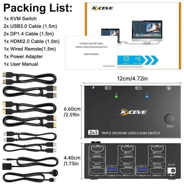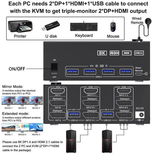 [HDMI+ 2 Displayport 3 Monitor KVM SWITCH] This KVM switch is perfect for connecting 2 desktops or laptops to share 3 monitors and control them all with just one set of keyboard and mouse. Supports extended, mirrored displays; It requires every Laptop/PC support 3 screen or above display functions and must support extended display.