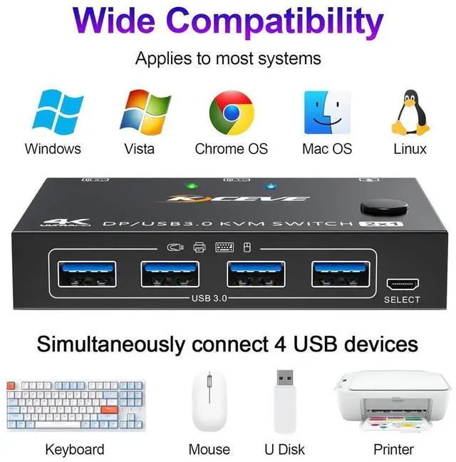 DP KVM switch supports most DP input devices: PC, laptop, TV box, Xbox One, App1e TV, PS3, PS4, PS5, S-o-ny Blu-ray player, projectors.