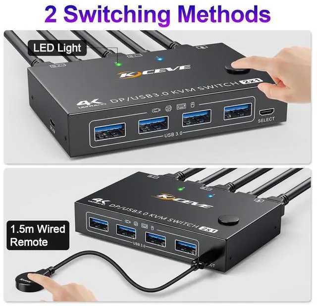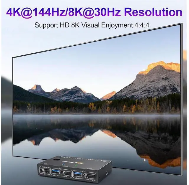 USB 3.0 DisplayPort 1.4 KVM Switch 2 PC 1 Monitor 4K@144Hz 8K@30Hz