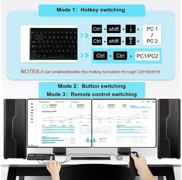 Multiple switching modes: Manual switching via buttons, IR remote control and keyboard hotkeys for quick channel selection.