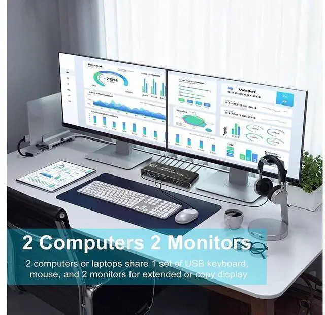 KVM switches are used to control computers or laptops that share a set of USB keyboards, mice, and dual monitors, and to extend or duplicate the monitors.