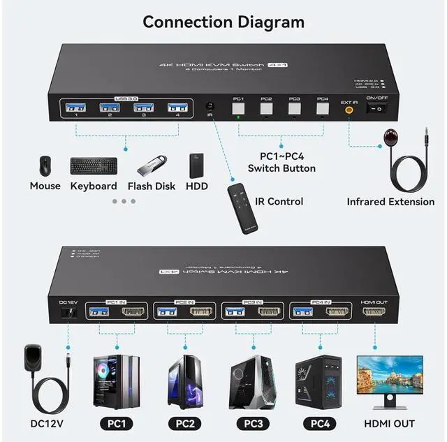 [KVM switch 4 PCs 1 Monitor] The hdmi kvm switch allows 4 computers or laptops to share 1 monitor and 4 USB 3.0 devices. You can control all 4 computers directly with a single set of mouse and keyboard. Switching between the 4 computers is easy using the panel buttons or an external remote.