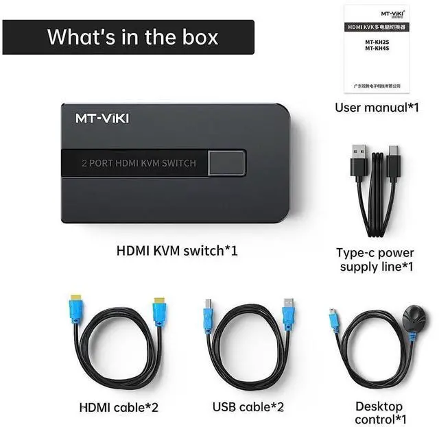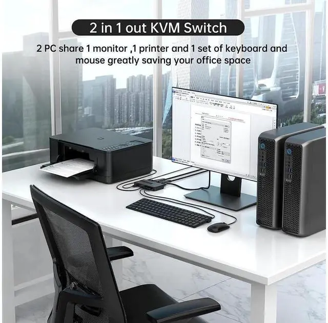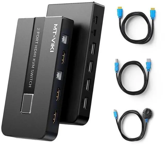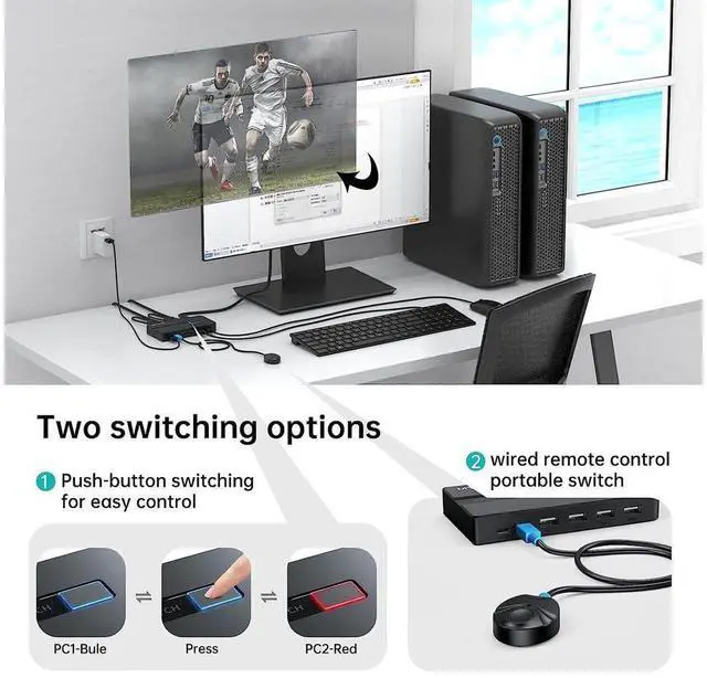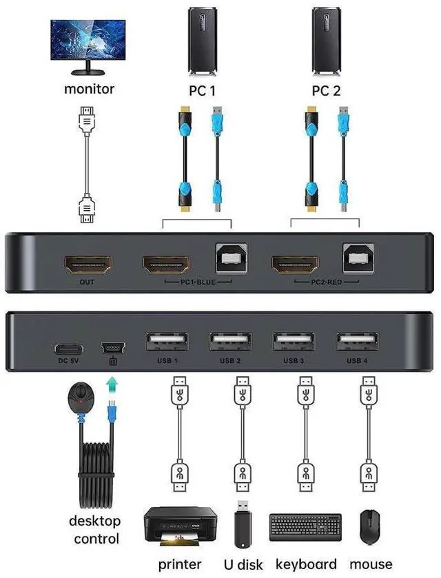 This KVM Switches HDMI 2 port box can makes 2 computers to share 1 monitor and 4 USB devices. Switch between two computers by pressing the button on the KVM panel. Also come with a wire-desktop controller for easy switching.