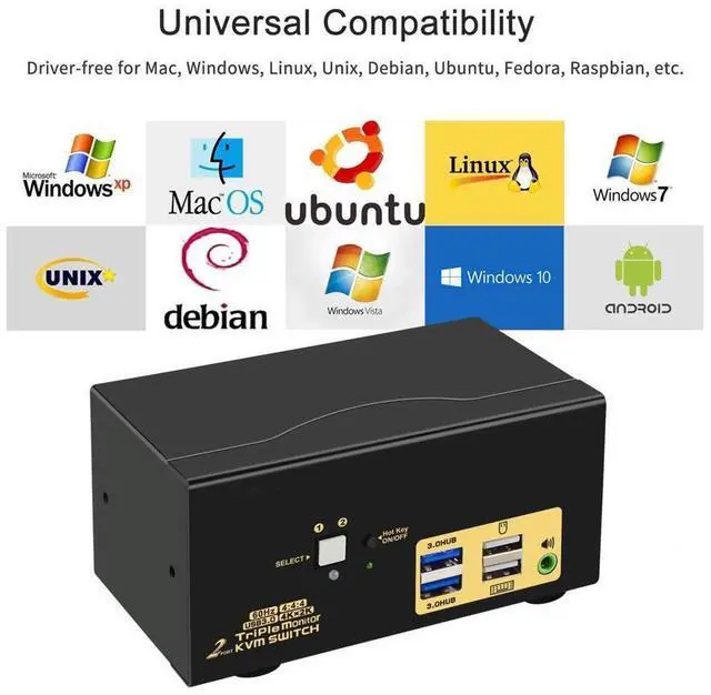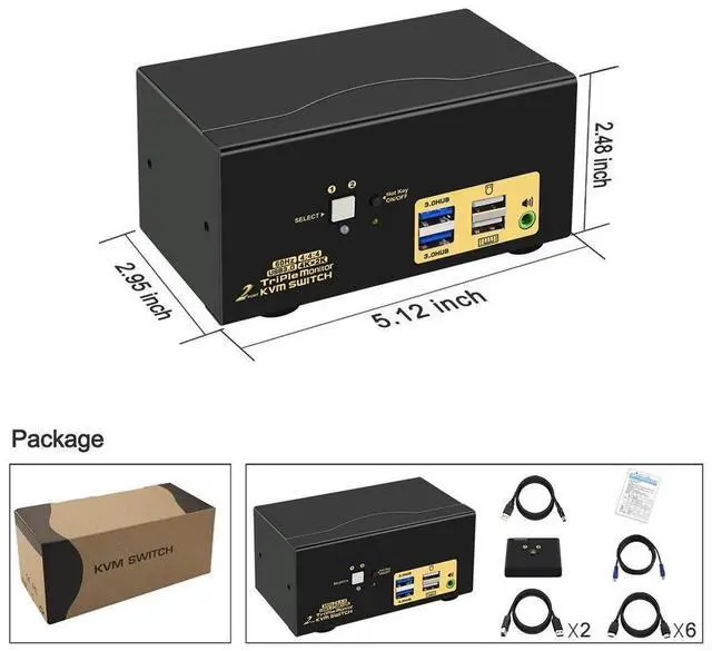 1 x HDMI KVM switch + 1 x DC5V 2A power adapter + 2 x USB 3.0 cable + 6 x HD-MI cables + 1 manual + 1 wire remote push button switch
