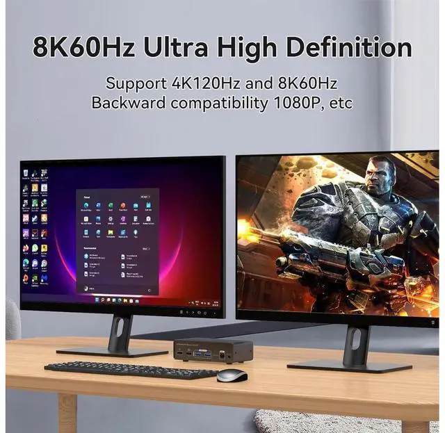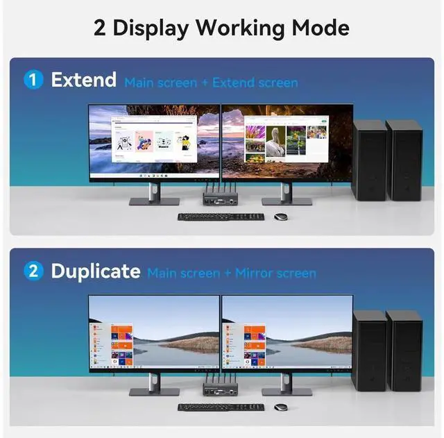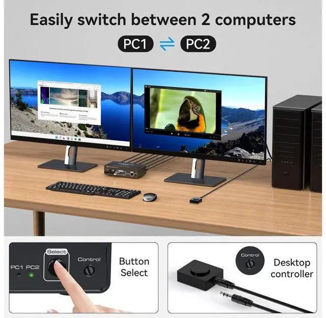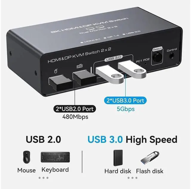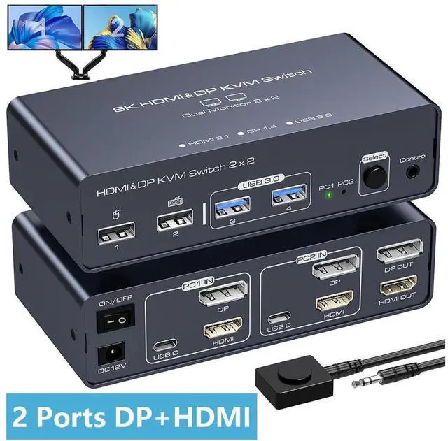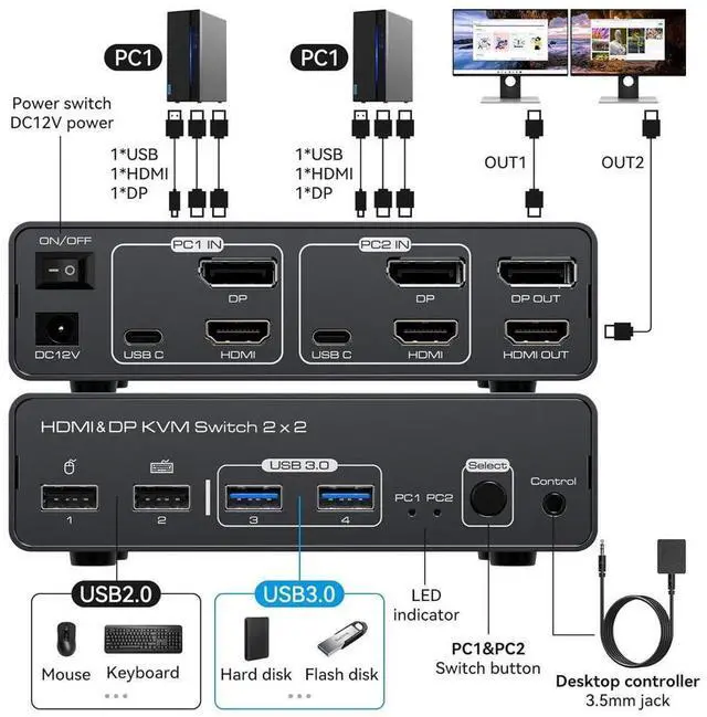 2 Ports HDMI+DP Dual Monitor kvm switch dual monitor shares 2 monitors and 4 USB 3.0 devices, connects to 2 host computers to share a mouse, keyboard, printer, USB stick or gamepad.