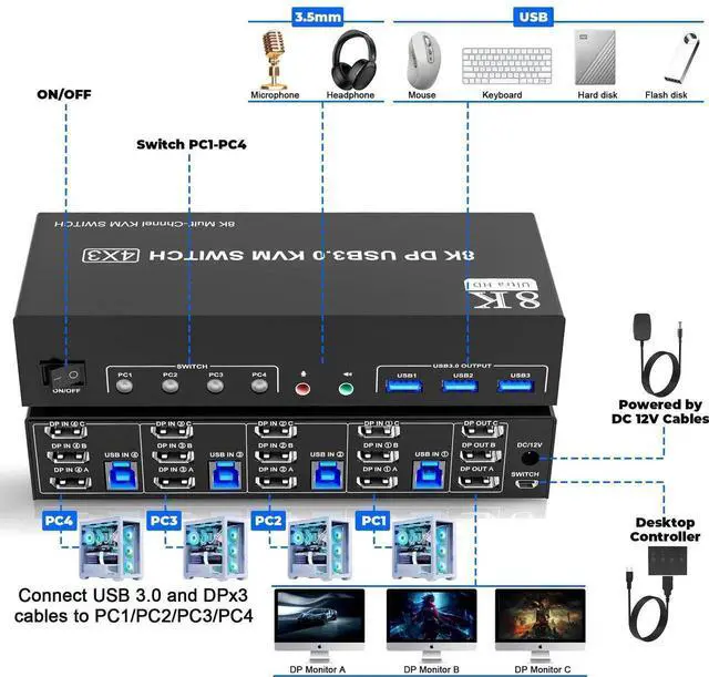 8K@60Hz DisplayPort 3 Monitors 4 Computers KVM Switch, DP 1.4 KVM Switch 4K@144Hz Triple Monitor for 4 Computer with Audio and 3 USB 3.0 Ports, KVM Triple Monitor Keyboard Mouse Switcher