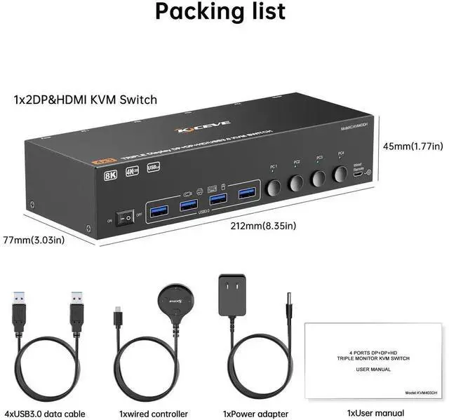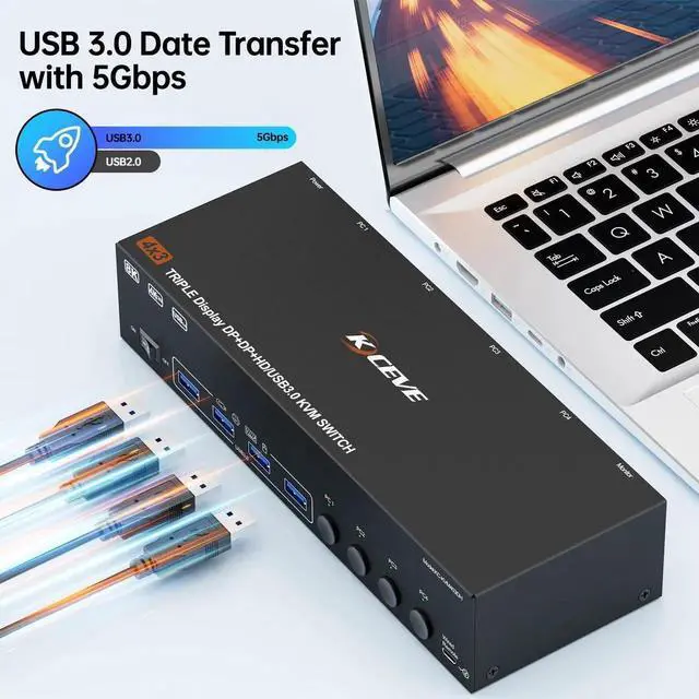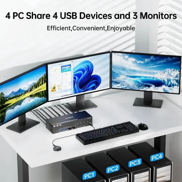 KVM switch 4 computers 3 monitors can control 4 computers or laptops with 1 independent set of keyboard and mouse, share 3 monitors and 4 USB 3.0 hub.With 4 USB3.0 ports for peripheral USB devices such as keyboard, mouse, printer, etc.