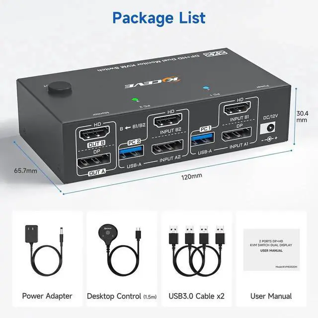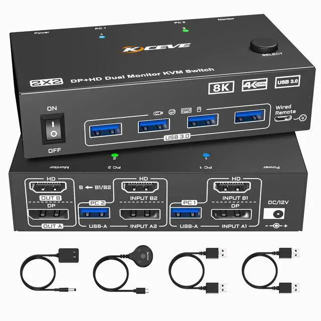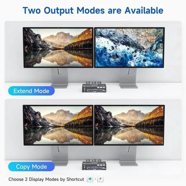 - [Easy to Use & Stable Power]Dual monitor KVM switch is plug and play, no need to install software or drivers,very convenient and fast. The KVM switch comes with a 12V power adapter. (The power supplied via the PC host's USB port is insufficient to drive high-power USB devices like external hard disks.) The external power design ensures stable operation for all connected USB peripherals.