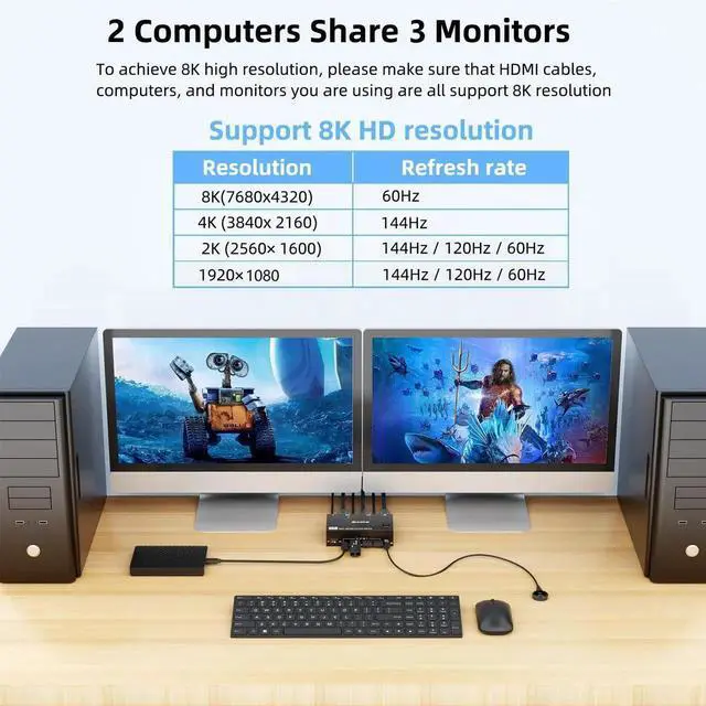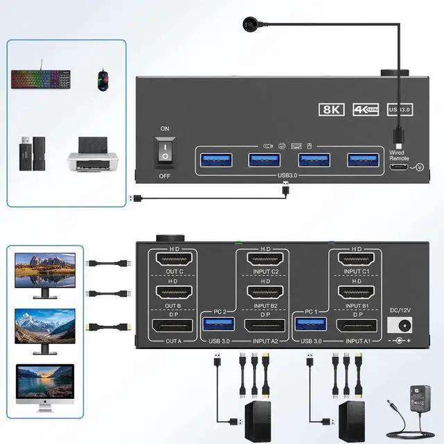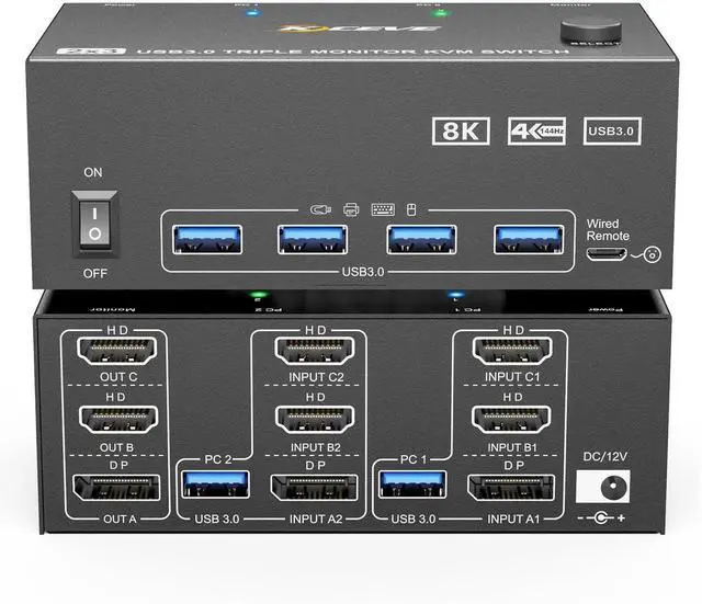 KVM Switch 3 Monitors 2 Computers 8K@60Hz/4K@144Hz, HDMI Displayport KVM Switches for 2 PC Sharing Triple Monitor and Keyboard Mouse with Power Adapter, Wired Extend Controller and USB3.0 Cables