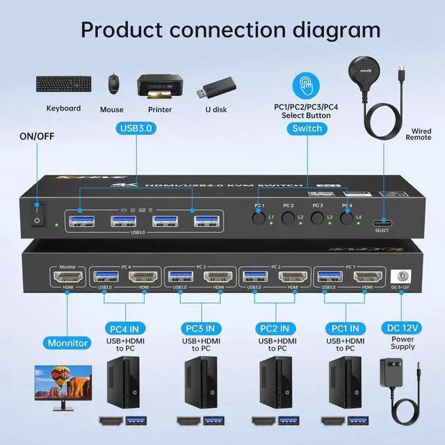 HDMI KVM Switch 4 Computers 1 Monitors 4K@60Hz 2K@120Hz,4 Port KVM Switch with Simulation EDID for 4 PCs Sharing Monitor Keyboard Mouse Hard Drives Printer Wired Remote,Power Adapter Included The 4-port HDMI KVM switch supports 4 computers sharing 1 monitor,1 set of keyboard and mouse,and 4 USB 3.0 peripherals (5Gbps transmission),saving space and flexibly switching to enhance efficiency; HDMI KVM switcher 4 Port supports 4K@60Hz ultra-high definition (compatible with 2K/1080P..etc), comes with an HDMI cable; quick switching via panel buttons/controller,with LED real-time display control;4K HDMI KVM is compatible with mainstream systems such as Windows/MacOS,with power supply ensuring stable operation,Our KVM offers 12 months of free replacement after-sales service.