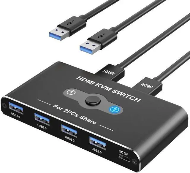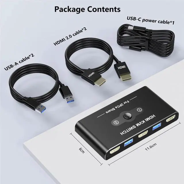 - [No Worry to Buy]The KVM Switch 1 Monitors 2 Computers comes with 12 months after-sales service and 24 hour online technical support. If the HDMI KVM does not work properly for your computer, please feel free to contact us at any time. Package Content: 2* USB 3.0 Cable, 2*HDMI 2.0 Cable, 1* USB-C Power Cable, 1* User Manual.