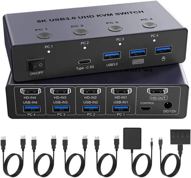 8K@60Hz HDMI KVM Switch 4 Computers 1 Monitor with 4 USB 3.0 Ports Aluminum KVM Switches Share One Monitor Keyboard Mouse Hard Drives Printer with 4 USB Cables and Desktop Controller