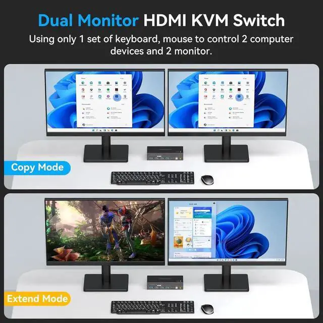 - KVM Switch Dual Monitor 2 In 2 Out: This dual monitor KVM switch allows you to control 2 computers using one set of keyboard and mouse, sharing 4 USB3.0 devices and 2 monitors, and supports duplicate mode and extended mode (requires your computer to have 2 HDMI ports). Duplicate Mode: both computers display the same screen, Extended Mode: both computers display different screens.