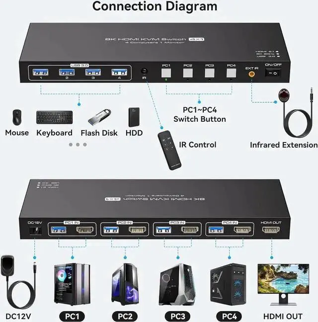 4 computers/laptops share one set of keyboard, mouse and 1 monitors, and more USB 3.0 peripherals;