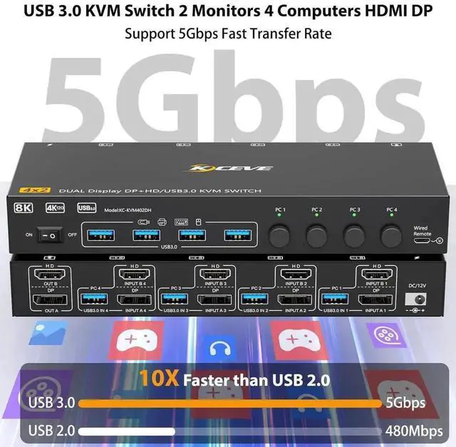The USB 3.0 KVM switch 4 ports meets your requirements for HD videos with high refresh rate and high quality. The KVM switch 4 PCs HDMI ports supports 8K@60Hz, 4K@120Hz. 2K@165Hz. The KVM switch 4 ports Displayport ports supports 4K@144Hz, 2K@165Hz and is backward compatible. Please use HDMI 2.1 and DP 1.4 or higher quality 8K cables with KVM Switch 4 PC.