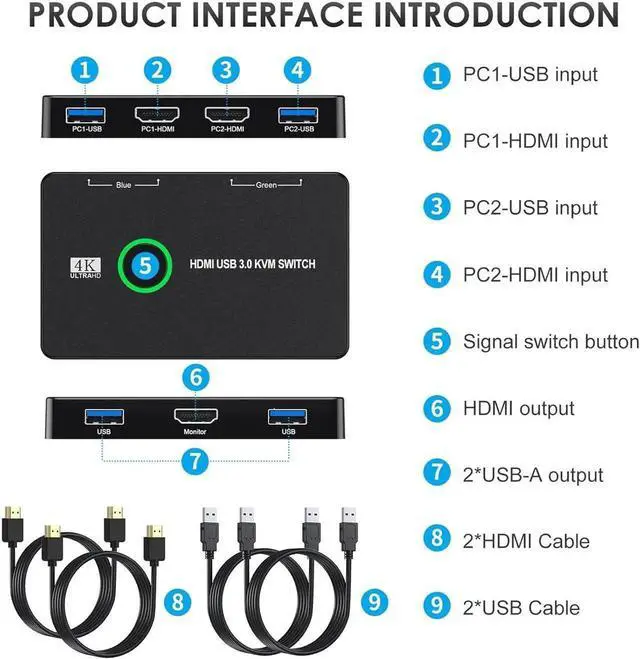 USB 3.0 HDMI SwitchThe USB 3.0 port of this KVM switch supports ultra-fast USB 3.0 data transfer rates of up to 5Gb/s (10 times faster than USB 2.0 ), provides high-bandwidth support, allows you to enjoy efficient and smooth data transmission between the computer and external devices. (backward compatible with USB 2.0 and USB 1.1 devices. )