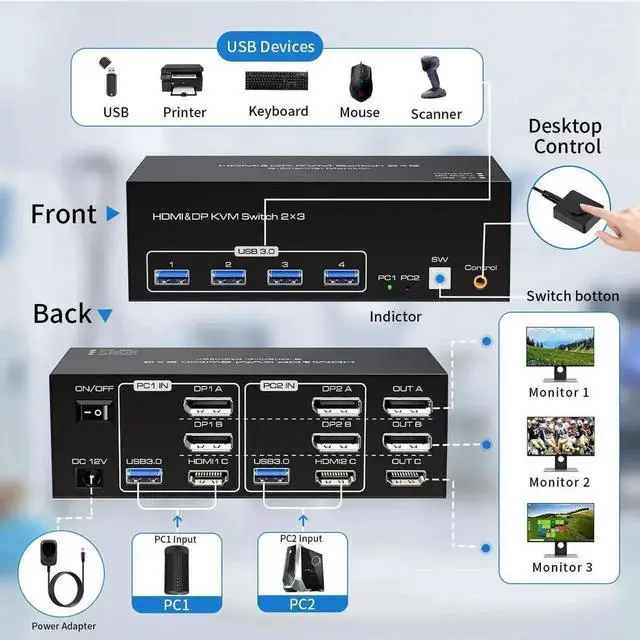 • [KVM Switch 3 Monitors 2 Computers] The KVM Switch allow 2 computers to share 1 HDMI+ 2 DP monitors and 4 USB 3.0 ports,Like mouse, keyboard, printer, etc. Supports extended and mirrored display modes,extended mode can output 3 different screens and mirror mode can output 3 identical screens.