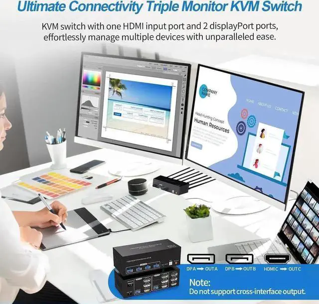 8K HDMI+2DP Triple Monitor KVM Switch for 2 Computers Share 3 Monitors and 4 USB 3.0 devices.