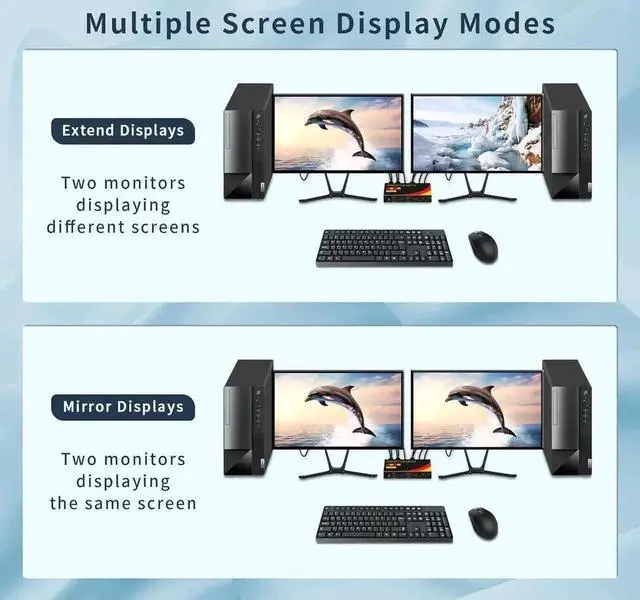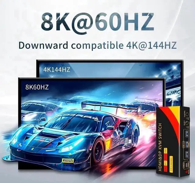 These dual-monitor KVM switches support up to 7680*4320@60Hz and are backward compatible with 4K@120HZ, 2K@144HZ and below. Supports HDMI 2.1 and
