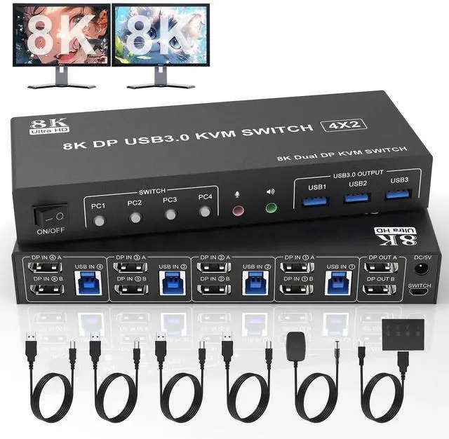 8K DP1.4 Dual Monitor KVM Switch DisplayPort 4 computers share 2 monitor and 3 USB 3.0 device