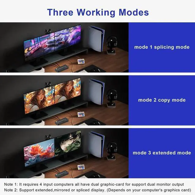 This 4 port kvm switch dual monitor supporting high resolution max up to 8K@60Hz, and also supports 4K@60Hz or other lower resolution (Downward Compatible).
