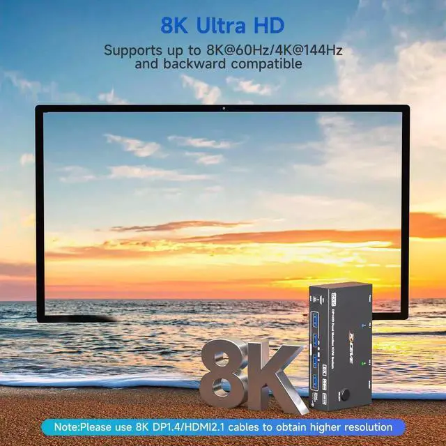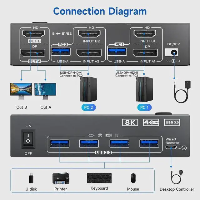 - [Easy to Use & Stable Power]Dual monitor KVM switch is plug and play, no need to install software or drivers,very convenient and fast. The KVM switch comes with a 12V power adapter. (The power supplied via the PC host's USB port is insufficient to drive high-power USB devices like external hard disks.) The external power design ensures stable operation for all connected USB peripherals.
