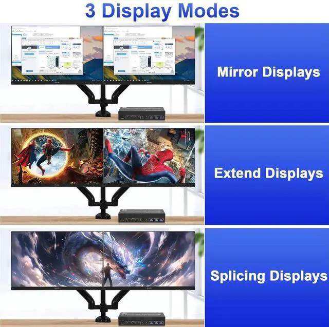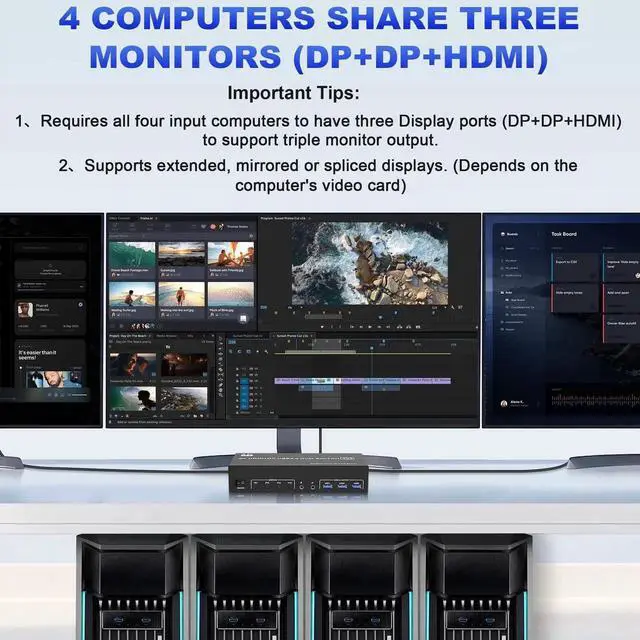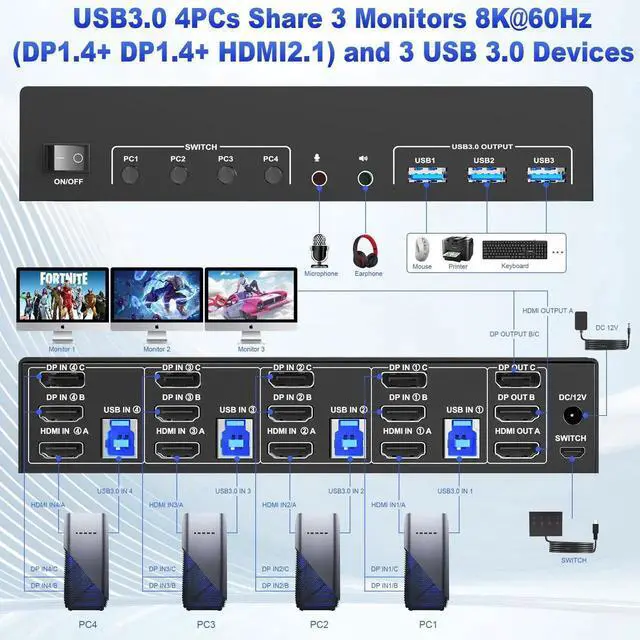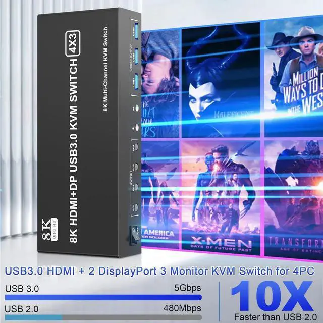 8K@60Hz 4 Port USB 3.0 Triple Monitor 1 HDMI + 2 DisplayPort KVM Switch for 4 Computers Sharing 3 Monitor and 3 USB 3.0 Ports, Audio & Microphone