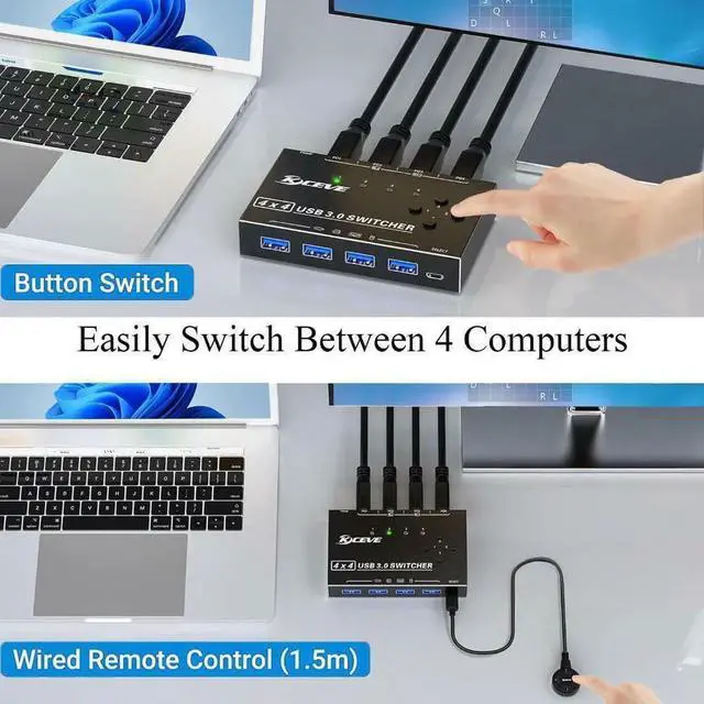 [2 Switching Methods]The USB switch selector supports both button and remote control switching: Press the top button on the USB 3.0 switch for direct, quick toggling. Hide the switcher and use the wireless remote (included) to switchkeeping your desktop neat and clutter-free, with no messy exposed cables.LED light on the USB 3.0 switch will indicates the active computer. Choose the mode that suits you best.