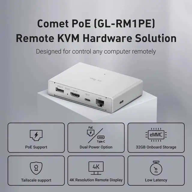 GL. iNet Comet PoE (GL-RM1PE) Remote KVM Control Over Internet - PoE/Type - C Dual Power Option 4K@30Hz, 32GB EMMC Tailscale Support for PC Server Remote Access Power Management Adapted KVM Switches