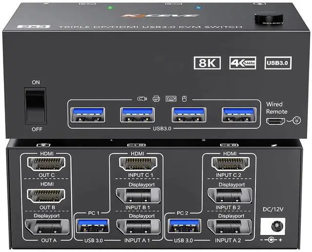 HDMI Displayport KVM Switch 3 Monitors 2 Computers 8K@60Hz/4K@144Hz, USB 3.0 KVM Switches for 2 PC Sharing Triple Monitor and Keyboard Mouse with Power Adapter, Wired Extend Controller and USB 3.0 Cables