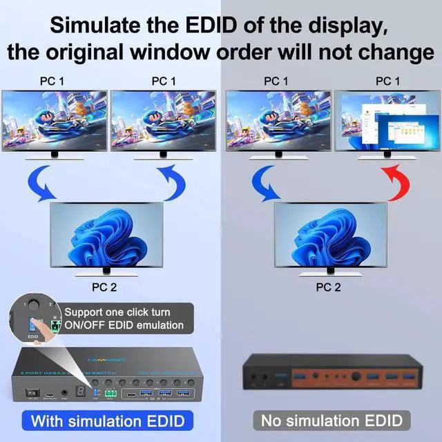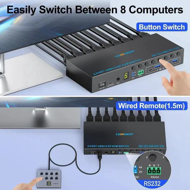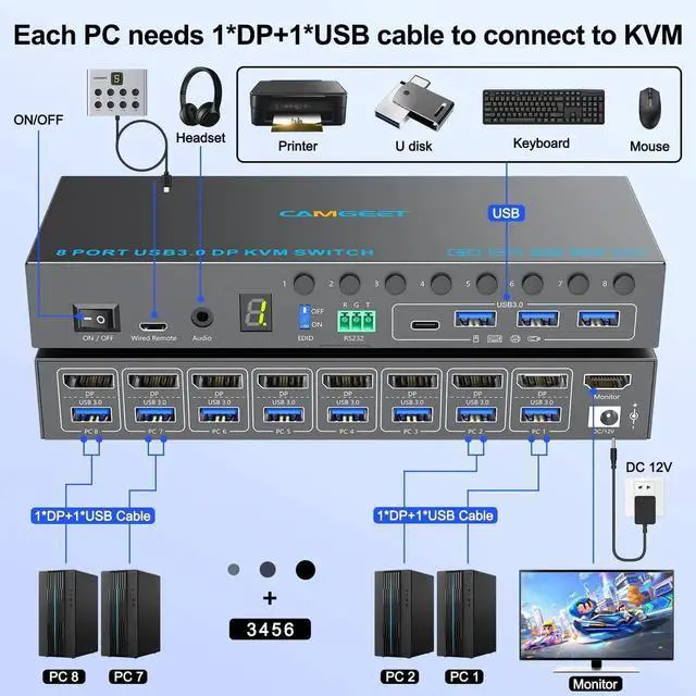 8 Port Displayport KVM Switch 4K@60Hz EDID Simulation, USB 3.0 KVM Switch Displayport for 8 Computers Share 1 Monitor and 4 USB Devices, KVM Switches with Audio RS232 Wied Remote 12V Power and USB Cable