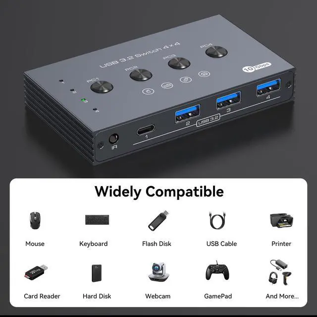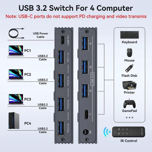 USB 3.2 Switch 4 Computers This usb hub switch supports 4 computers to share 3 USB A ports and 1 USB C port for devices such as mouse,keyboard,printer,scanner,USB memory stick,etc.The USB C to USB A adapter included in the package solves the problem of inconsistent interfaces.Note: Not a KVM switch,does not support monitors.PD charging is not supported,Not supporting power supply for other devices