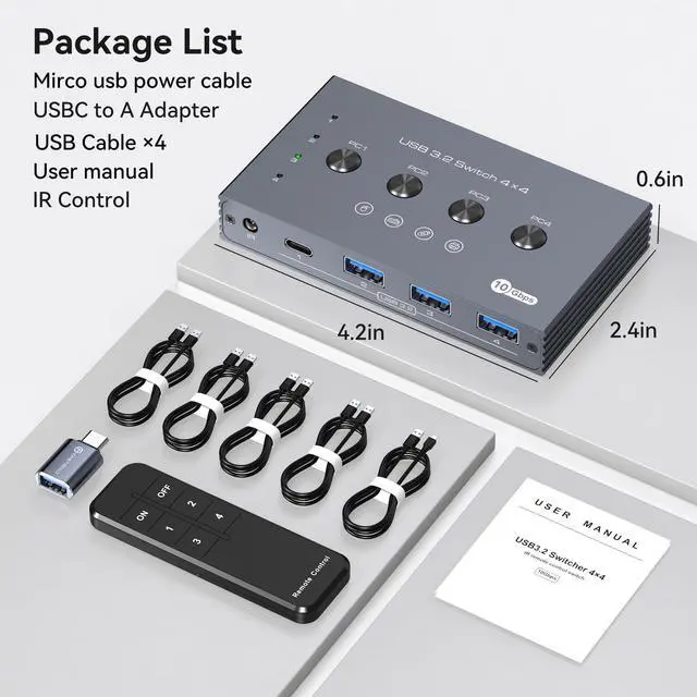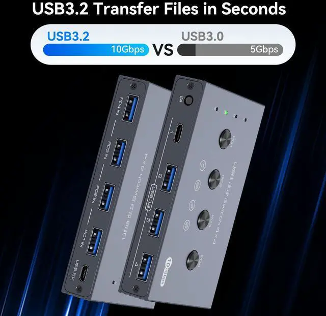 10Gbps USB 3.2 Switch 4 Computers Share 4 Peripherals 4 Port USB Switcher for Mouse Keyboard Printer with Remote and Cables