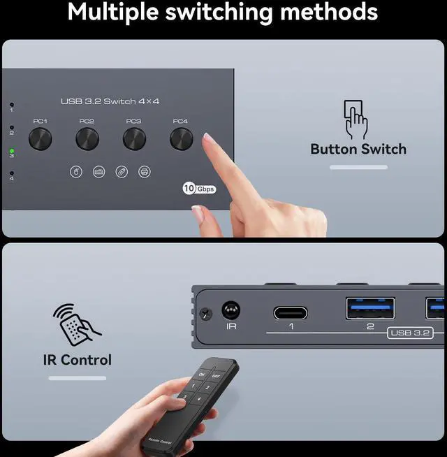Two Switching MethodsThis usb switch with remote has two switching methods, Button Switching: Simply press the selector button on the machine to switch the signal source, Remote Switching: Using the wireless remote control to switch, you can place the USB switcher outside of the work area to make the desktop more neat and tidy