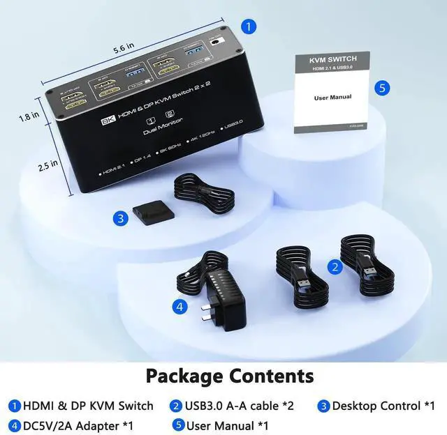 [Packing List]kvm switch dual monitor kit includes: KVM Switchx1, 1.5m desktop controllerx1, 1m USB3.0 cablesx2, 5V power adapterx1, and user manualx1. If there is any problem with usage, please contact us via Amazon order number. Note: Users are required to provide their own HDMI and DP cables.