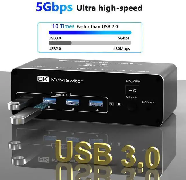 [USB 3.0 KVM Switcher]This HDMI KVM switch 2 port is equipped with 4 USB 3.0 ports that can reach a [USB 3.0 Hub (5Gbps) with 4 Portsr]Share keyboard, mouse, printers, and USB drives across both PCs. Backward compatible with USB 2.0/1.1 devices. Note: Adapters are not supportedconnect USB devices directly to avoid recognition issues.