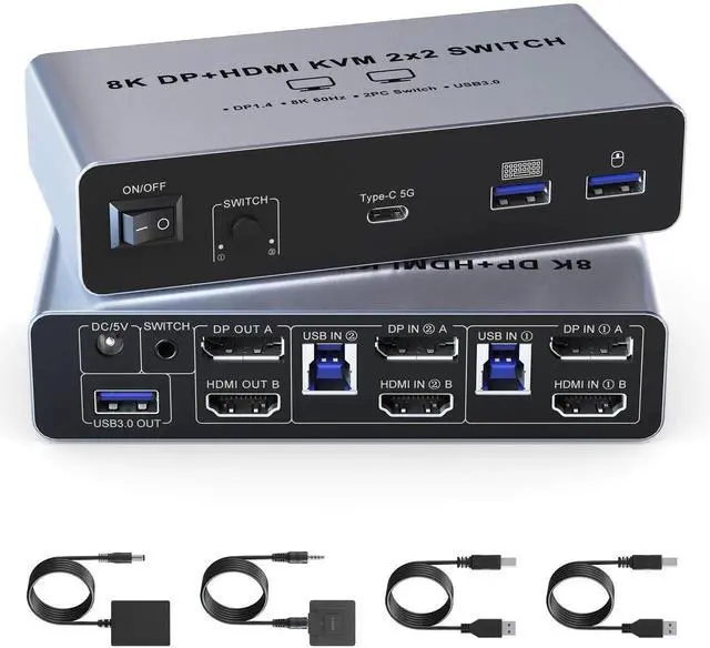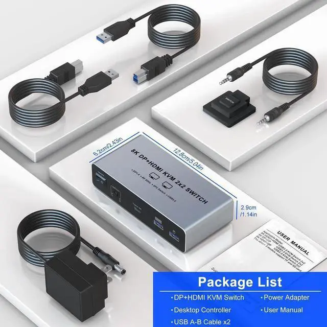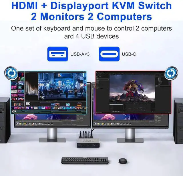 Product usage requirements: 1. Please ensure that both of your computers or laptops have HDMI + DP output ports and one USB A output port; 2. Please ensure that both of your monitors have one HDMI input port; 3. The KVM switch requires the use of HDMI 2.1-compliant cables no longer than 6 feet in length to ensure proper video signal transmission; Note: HDMI cables are not included in the packaging; please prepare them separately
