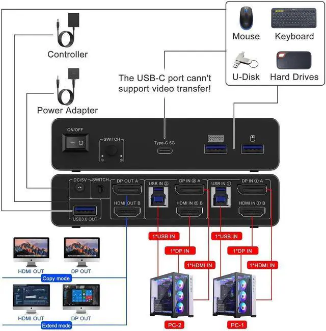 Dual Monitor KVM Switch: This dual display KVM Switch allows you to use a set of keyboard and mouse to control 2 computers, share 3 USB + type c devices and 2 monitors and support copy mode and extension mode (requires your computer to have HDMI + DP ports) copy mode: two monitors output the same picture, extender mode: two monitors output different pictures
