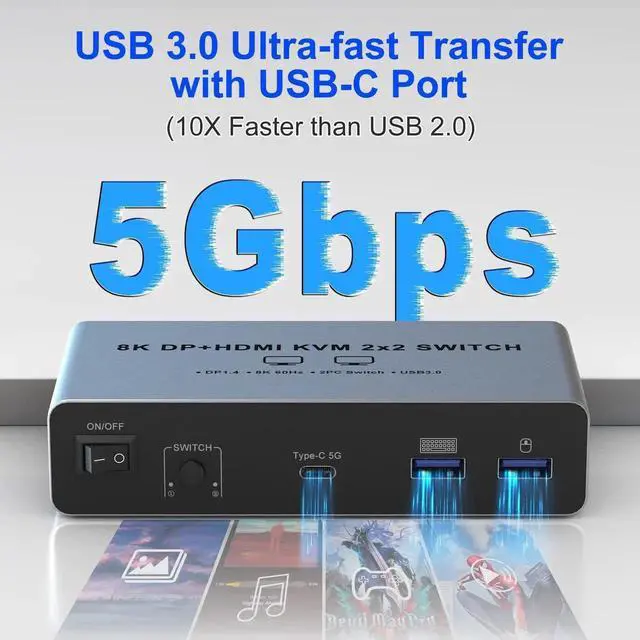 USB 3.0 KVM Switch: In addition to two HDMI ports, this KVM switch also has a type-c port + 3 USB 3.0 ports with a data transfer rate up to 5Gbp/s, which is 10 times faster than USB 2.0 ports. USB 2.0 devices are compatible. It can be used to share USB devices such as printers, scanners, webcams, wired or wireless keyboards and mice, and more. Use of high-power USB devices requires use of the supplied 12V power supply. Support Windows/Vista/XP and Mac OS, Linux and Unix and other systems.