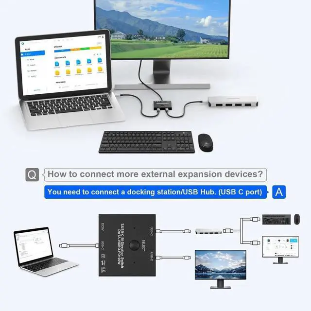 [Bi-Directional USB-C Switch]: This USB C switch selector allows 2 USB-C video sources to share 1 monitor or 1 video source to share 2 monitors. The standard USB-C USB3.1 Gen-2 cables (Included, 0.8m/2.62ft) need to be connected and a USB cable used to power the switch.