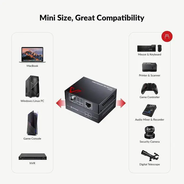 Long Range USB ExtensionPowered USB Range Extender supports high-speed USB2.0 (Up to 480Mbps) over single Cat5e/Cat6 cable up to 196 ft(60m); Supports all operating systems (Windows, MacOS, Android, Linux); High compatibilty with USB 1.1 and USB 2.0 peripheral devices. Certificated by FCC, CE.