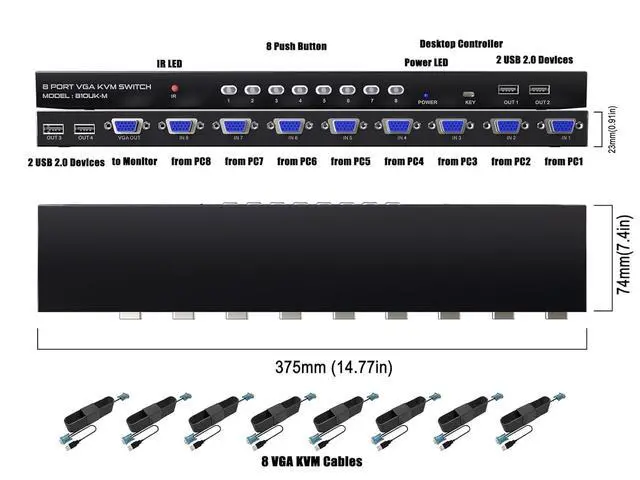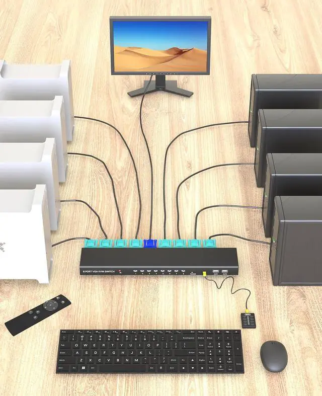 Versatile KVM Switch: Allows 8 computers to share a single monitor, keyboard, mouse, printer, and USB devices for streamlined workstation setup.