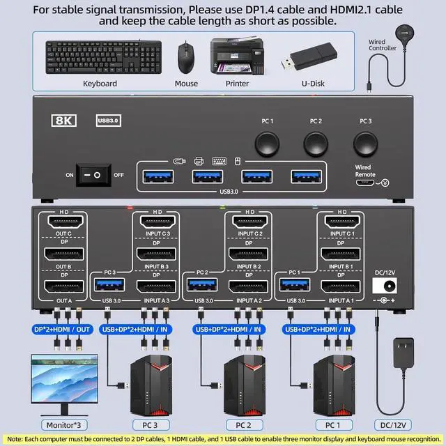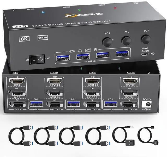 KVM Switch 3 Monitors 3 Computers 8K@60Hz 4K@144Hz, HDMI Dispalyport Triple Monitor KVM Switches with 4 USB3.0 Port for USB Devices, Support Extended/Mirror Mode, Wired Controller and USB3.0 Cables