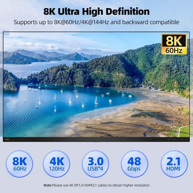 Ultra HD 8K Visual EnjoymentHDMI Dispalyport KVM 3 port switch supports resolution up to 8K@60Hz, 4K@144Hz.(HDMI port: support 8K@60Hz/4K@120Hz, DP port: support 8K@30Hz/4K@120Hz )Note:Please use HDMI2.1 and DP1.4 cables for a better experience, shoif the set distance allows,the length of cables more short more better.