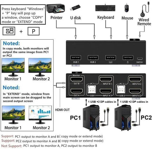 • [HDMI KVM Switch 2 Monitors 2 Computers] KCEVE KVM Switch Dual Monitor HDMI allows you to control 2 computers using only one set of mouse, keyboard, printer, scanner and monitor, and supports webcam. You can press Windows+P to select Mirror Mode or Extended Screen Mode to switch between the 2 monitors freely. Each computer requires 2 HDMI cables + 1 USB cable to be plugged into the KVM switch HDMI