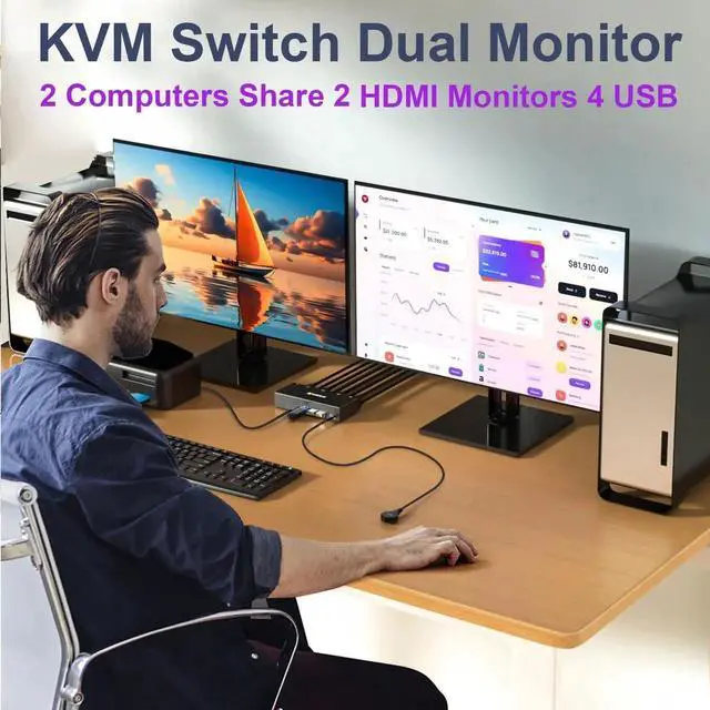 Dual Monitor KVM Switch 2 Computers Share 2 Monitor and 4 USB Devices