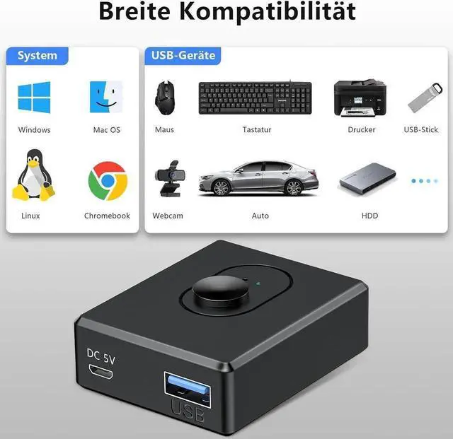 PC: The USB switch allows you to switch between two computers with one click to share a USB 3.0 peripheral. Or switch between using 2 USB devices for 1 computer. Very suitable for mouse, keyboard, USB hub and other devices.